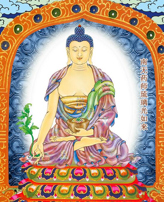 七佛药师立体坛城,圆形,中间一佛,六佛围绕;七佛四周日光、月光、药王、药上菩萨围绕;最外十二药神将围绕;坛上有药师十二大愿幢悬挂;坛外后墙可布置单尊药师画像,左五轮塔图、右北斗七星药师分布图。