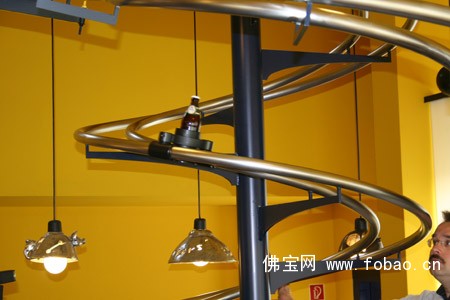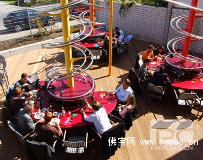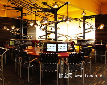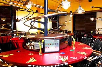 客人入座以后,可以通过餐桌上的触摸屏、甚至是通过发电子邮件和短信息来点菜。而上菜则是通过一个螺旋样的传送带送到您的桌边。