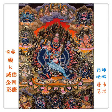 简介 这幅唐卡应该是药师坛城唐卡艺术中心和药师坛城藏品馆有史以来和大家分享最高的一幅收藏级大威德金刚唐卡了。画面布局规范,构图严谨,神灵众多但排布有序;设色富丽浓艳..