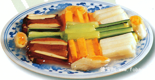 主料:主、配料:胡萝卜、黄瓜、白萝卜、五香豆腐干各100克。 调料:素油50克,精盐5克,白糖5克,淀粉20克,味精5克,芝麻油15克,姜末适量。