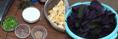 材料:紫色番薯叶、薄荷叶、切碎的芹菜梗、粟米块、盐、胡椒粉、椰汁、植物油。