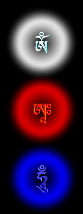 顶轮、喉轮及心轮分别有藏文白“嗡”(om)字、红“阿”(ah)字及蓝“吽”(hum)字。实际上“嗡,阿,吽”三字,也是印度梵文声母的总纲。