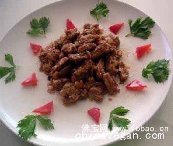 3、锅内留少许植物油放入姜末、洋葱末和调味料烧入味后,放入炸过的素肉块,翻炒,再勾薄芡,淋麻油,装盘装饰。