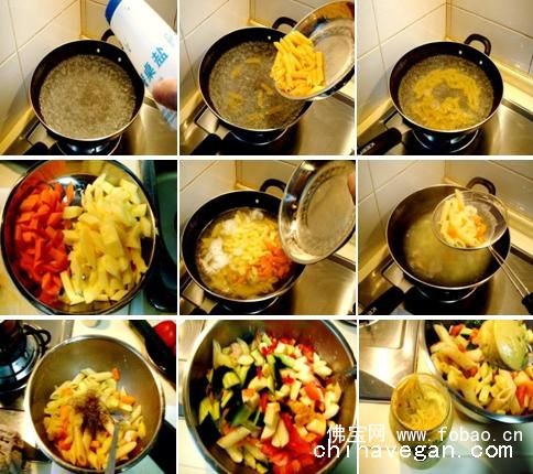 3、当通心粉煮到5分钟后,下入胡萝卜丁和土豆丁同煮,最后倒入魔芋素虾烫熟即可捞出;