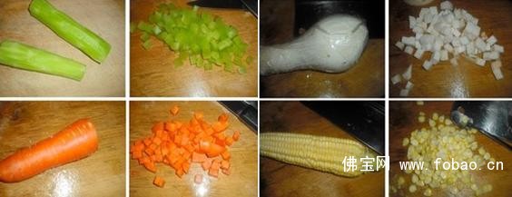 2、杏鲍菇切丁;玉米剥粒;