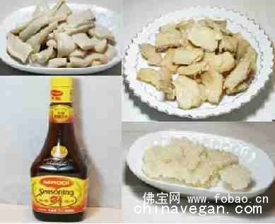 1、 将杏鲍菇洗净放入锅里煮熟,冷却后切3毫米厚的片,放素易鲜、十三香、美极酱油3克生粉腌渍上浆备用。腌好后拍干生粉,使杏鲍菇片裹匀干生粉,入五成热(约180℃)的宽油中小火炸30秒钟,捞出控油备用。