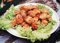2 、每块素肉沾裹地瓜粉,熟油炸酥即可食用。