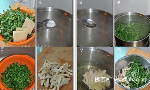 材料:豌豆苗、香干、盐、糖、蘑菇精、香油