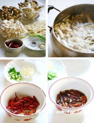 简介 材料:杏鲍菇,蟹味菇,白玉菇,金针菇(其他种类的新鲜蘑菇均可)调料:干红辣椒,花椒,香葱,蒜做法:1、将几种蘑菇用水冲洗两遍,烧一锅开水,将蘑菇放入焯至熟后捞出,..
