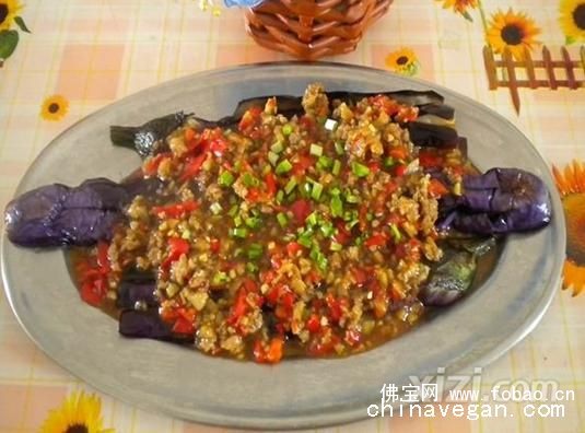 在油锅内放入蒜蓉爆香,下素肉末(用盐、香油、生粉腌制一会)、盐、豆酱翻炒(加白醋水),之后放入红辣椒(剁碎),最后用酱油生粉水勾芡淋在茄子上即可。