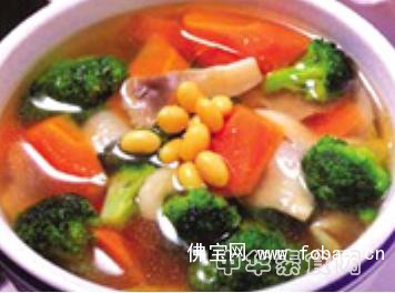 3、待红萝卜块煮烂时,下入泡透的黄豆、西兰花,调入盐、味精、白糖,煮透即可食用。