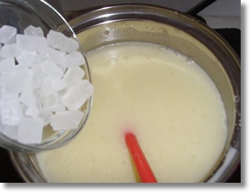 锅内加凉水,玉米粉糯米粉放进后搅拌均匀,然后点火开煮,冰糖也可以放进去了,记住要搅拌,防止粘锅底.