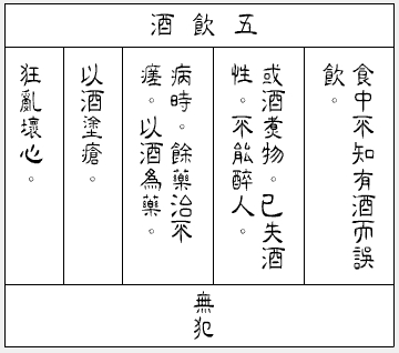 佛种种诃责饮酒过失已。告诸比丘。优婆塞不得饮酒者。有二种。谷酒。木酒。(谷酒可知。)木酒者。或用根茎叶华果。用种种子。诸药草杂作酒。酒色。酒香。酒味。饮能醉人。是名为酒。若优婆塞尝咽者。亦名为饮犯罪。若饮谷酒。咽咽犯罪。若饮酢酒。随咽咽犯。若饮甜酒。随咽咽犯。若啖麴能醉者。随咽咽犯。若啖滴糟。随咽咽犯。若饮酒淀。随咽咽犯。若饮似酒酒色。酒香。酒味。能令人醉者。随咽咽犯。