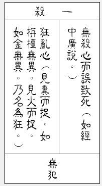 若狂。不自忆念。杀者无罪。(见粪而捉。如栴檀无异。见火而捉。如金无异。乃名为狂。更有心乱。痛恼所缠。二病亦尔)。