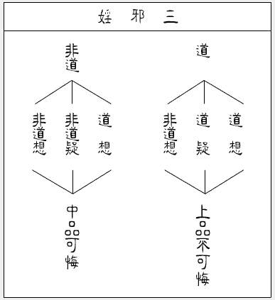 若发心欲妄语。未言者。犯下可悔。(远方便也。)言而不尽意者。犯中可悔。(或误说。或说不了了。仅名近方便罪也。)。若向人自言得道者。便犯不可悔。
