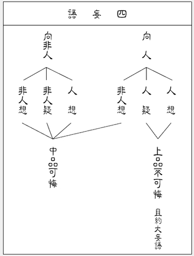 若人。作人想。杀。是罪不可悔。人。作非人想。杀。人中生疑。杀。皆犯不可悔。非人。人想杀。非人中生疑。杀。是中罪可悔。
