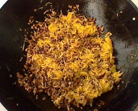 4、加豆干和榨菜继续炒,加五香粉,炒出香味后,加盐、花椒面。起锅备用。