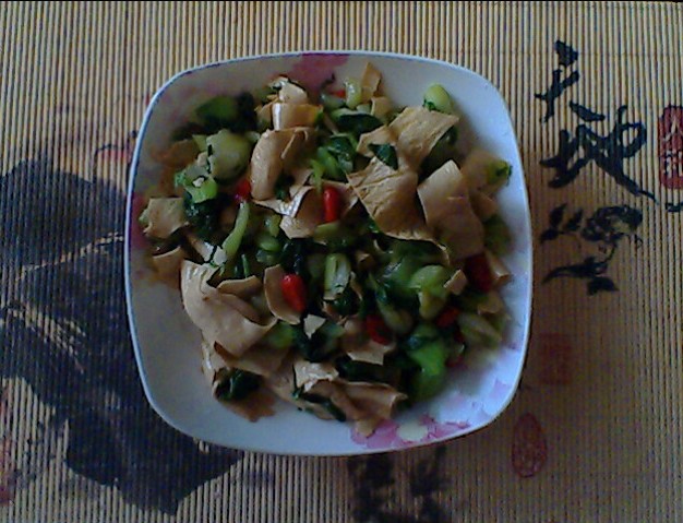3、煮菜梗时,把洗净的豆皮放进去一起煮。