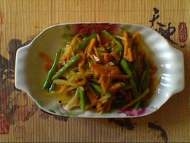 简介操作方法:1、所需原材料:土豆、老南瓜、四季豆。注:每样素菜的份量根据自己的喜好来增减2、土豆、老南瓜、四季豆洗净切丝,备用。3、将切成丝的四季豆放到开水锅里煮到8..