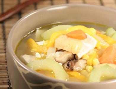2.放入白萝卜片、黄豆芽、西红柿、干香菇,加入盐、味精、胡椒粉(适量)、香油即可。