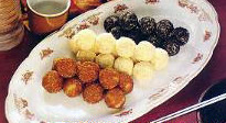 6、等糕饼凉了控干,放到糖液里。然后从糖液里捞出来其中的1/3蘸捣碎的洋蘑菇、另外1/3蘸捣碎的大枣、剩余的蘸松树花粉放到盘子里。