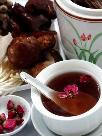 简介 主料:干玫瑰花,金针菇,草菇,鸡腿菇,白灵菇 调料:盐。 制法: 1.干玫瑰花洗干净,菌类洗干净切块。 2.把全部材料放入炖盅中,注入沸水,隔水炖1个小时。 3.炖..