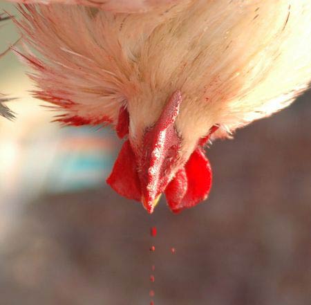 其中有一头牛双腿不停地在颤抖,似乎快站不住了,那种哀凄恐惧的神情实在是我一生中从没见过的。很快就有一个人走进来,把其中一头牛牵到比较宽敞的地方,两三个屠夫将牛的头抬起来,另外一个人由后面用铁锤猛向牛的额头锤下来,〝砰〞的一声,那只牛马上倒在地上,另外一个人拿着长长的尖刀,由喉部下面用力地向心脏直刺进去,并且用力地在心脏里面转了两三转,鲜血马上直喷出来。屠夫马上用一个桶子去装鲜血,这个时候,牛的四肢还在不断地抽搐,两眼瞪得大大的,嘴巴还呼呼作响,看到这里,我几乎要落下泪来,连呼吸都觉得困难。马上又有一个人剖开牛的胸膛,肠子内脏流得满地都是,锯子斧头毫不留情地在支解着那个还在抽搐的身体,它先失去了内脏又失去了头,接着又失去了腿,它的身体在我眼前被节节支解,此时,又有一只热泪盈眶的牛被牵了进来,我再也压抑不住内心的情绪,飞也似地往外面奔跑,连头都不敢回。这件事情过了好久好久,那些残酷的景象仍然一幕一幕地浮现在我的眼前。我常常想,人类的文明到底建筑在什么样的基础上,我们竟然用这种不人道的行为加诸在那些毫无抵抗力的动物身上。自诩为文明的人类,我们应该是感到光荣还是羞辱呢?