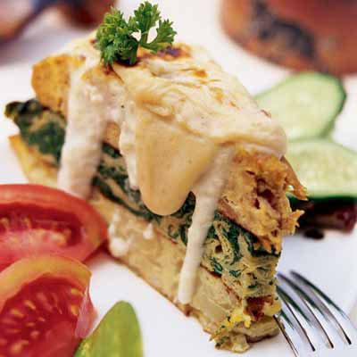 2. 炒锅中放入适量色拉油,用洋葱丁炝锅后,将三种蛋汁分别淋入锅中,摊成蛋饼,并将三张蛋饼摞在一起。