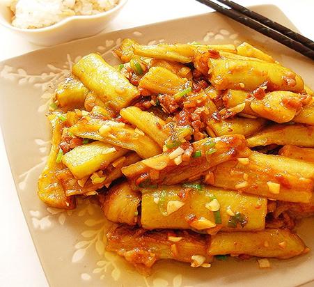 1、茄子削皮切条。总觉得皮会影响口感,但这个浪费了一部分营养,如果你在乎营养多于口感,就别削皮了。