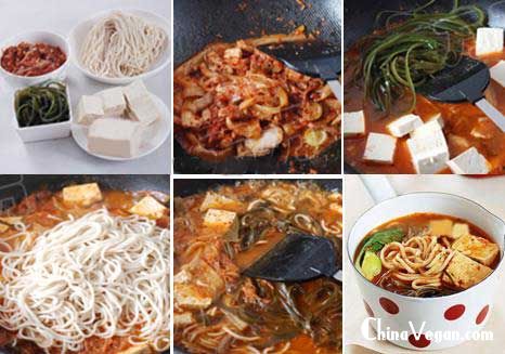 简介 材料:鲜切面300g,小油菜几颗,辣白菜+汁300g,豆腐150g,海带50g。植物油2汤匙,生抽1汤匙,淘米水1.5L。做法: 1、辣白菜切小块,豆腐切块,海带切几刀。2、锅里热少许..