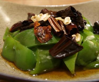 4、加入青椒及A料拌炒后起锅,洒上花椒粉及花生即可。