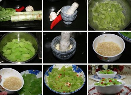 简介 原料: 莴笋、 蒜、 红菜椒、 盐 、白胡椒粉、 糖、 植物油。做法: 1、莴笋去皮,洗净,切成滚刀块,用少许盐腌半到一个小时(或放入沸水中焯一下),捞出用冷水浸凉。2、..