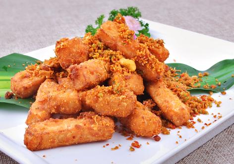 6. 起锅,倒入精制油,待油温升至5成热,放入步骤(4)的素鸡条,炸至表面成金黄色香脆倒出,沥干油。