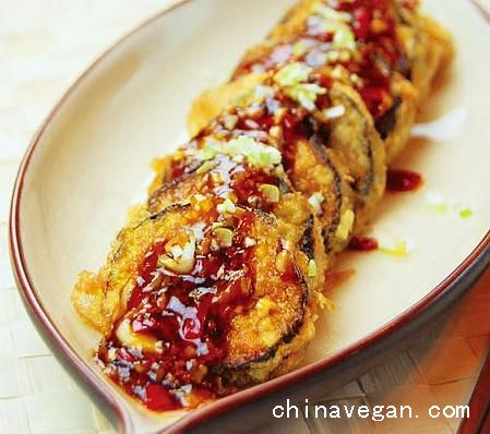 简介 材料:长条茄子400克、素肉馅100克、面糊150克、盐、味精、淀粉适量 调料:葱花15克、泡辣椒25克、姜末10克、蒜末15克、盐少量、生抽10克、糖15克、醋15克、味精少量、湿..
