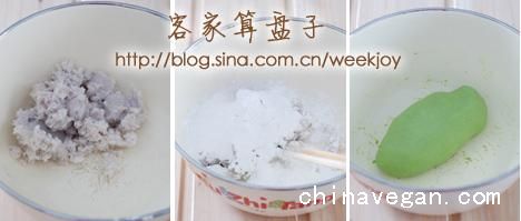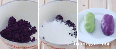 主料:芋泥100g,太白粉50g,菠菜汁20ml,紫薯泥100g,太白粉50g,水30g。
