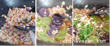 6、锅里热油,加洋葱,胡萝卜,素肉丁,香菇丁翻炒,倒入生抽。加入沥水的算盘子,翻炒2-3分钟至有些粘稠,加入蒜碎和香菜碎,翻炒均匀即可。