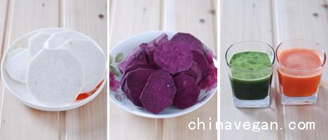 2、香芋和紫薯去皮切片,入锅蒸熟或微波炉打熟。菠菜胡萝卜打成汁。