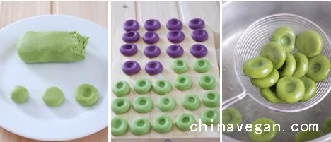 5、绿团揪一块(约10g左右),滚圆,稍按扁,用茶壶盖类似的小钮在中间按压做成算盘子。其他颜色的和绿团做法一样。开水入锅,分别煮至飘起捞出。 然后分别浸泡凉水。(做好的算盘子药全部煮好,浸泡凉水钟放冰箱,可放2-3天)