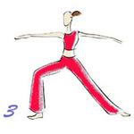 从新月状开始,将左脚放平,脚趾转30度,腿部仍然伸直,臀部转90度。右脚跟与左脚背保持一条线,膝盖保持在90度,臀部、身体和肩膀放松,居中,双臂平伸,与肩同高,手心向下。使劲伸你的指尖,好像去触墙。眼睛集中在右手的中指上,保持5次呼吸的时间。