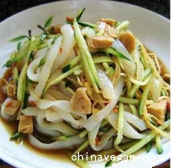 材料:玉带(魔芋宽粉)一包,面筋50g,黄瓜半根,豆芽50g