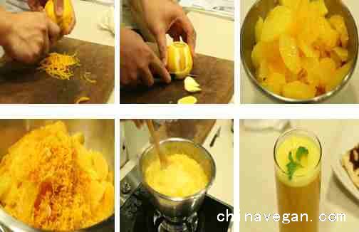 1、柳橙去皮(取黄色部分,白色会苦,切勿加入)。