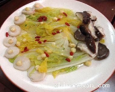 简介材料:娃娃菜、香菇、鸡腿菇、枸杞子;调味料:盐、糖、素易鲜、植物油、素高汤; 方法: 1、娃娃菜、香菇、鸡腿菇分别洗净、改刀、放入加少许盐、植物油的开水焯烫,,捞..
