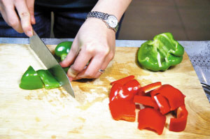 1 粉丝浸泡在清水里待用。洗净各种蔬菜沥干水。青、红椒去蒂和籽,切成块状;小棠菜对切成四份;洋葱剥去外衣,切成块状。