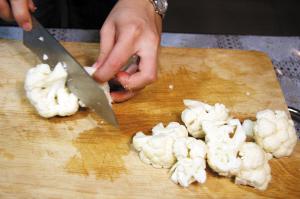 2 椰菜花切成小朵状;香芹摘去绿叶切成段;红萝卜削皮去头尾,切成滚刀块;蒜头拍扁去衣,剁成蓉;姜刮皮切成丝。