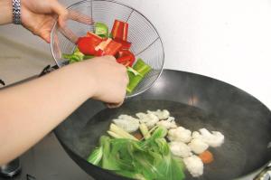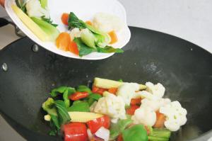 4 烧热5汤匙油,爆香姜蒜,倒洋葱、香芹、青红椒进锅,洒5汤匙清水炒1分钟,再倒入小棠菜、红萝卜、玉米芯和椰菜花翻炒1分钟。